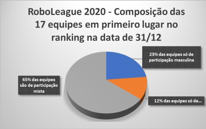 Ao final do ano de 2020, foram coletados os dados de composição das equipes que despontaram na primeira colocação do International Ranking of Robots segundo o mais alto índice de eficiência do robô no desafio/nível. Estas equipes compunham-se, em média, de 3,23 integrantes por equipe. Ver abaixo: